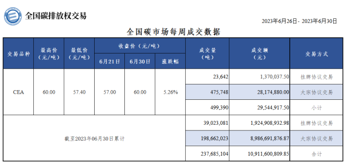 本周全国碳市场碳排放配额(CEA)总成交量499,390吨,总成交额29,544,917.50元。