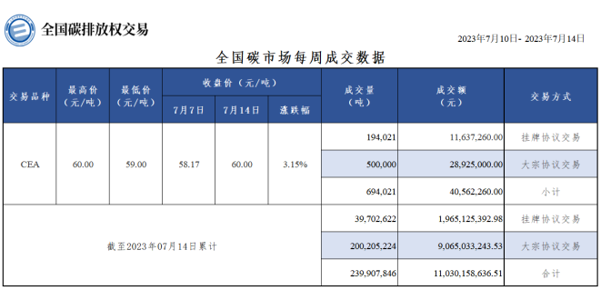 截至本周,全国碳市场碳排放配额(CEA)累计成交量239,907,846吨,累计成交额11,030,158,636.51元。