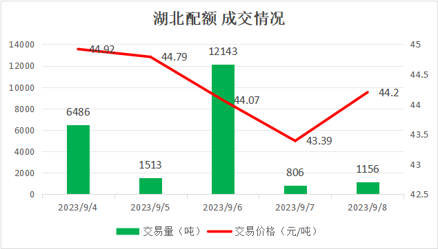 最高成交价44.92元/吨,最低成交价43.39元/吨,本周五收盘价为44.2元/吨。