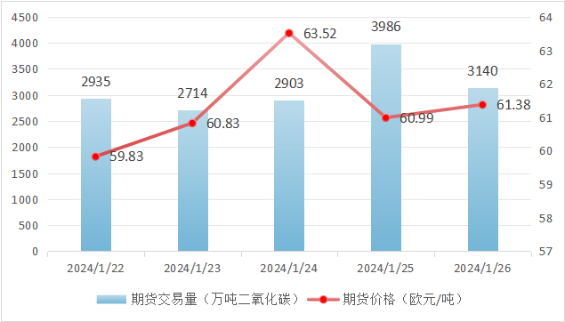 本周欧盟碳价整体由59.83欧元/吨上涨至61.38欧元/吨,涨幅2.6%。
