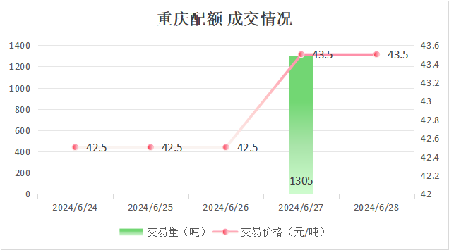 最高成交价43.5元/吨,最低成交价42.5元/吨,本周五收盘价为43.5元/吨。