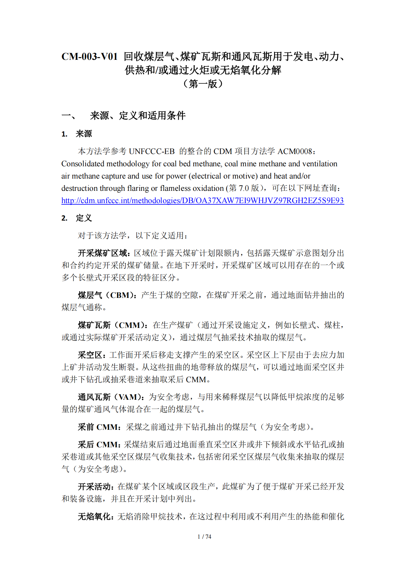 CM-003-V01 回收煤层气、煤矿瓦斯和通风瓦斯用于发电、动力、 供热和/或通过火炬或无焰氧化分解 (第一版)
