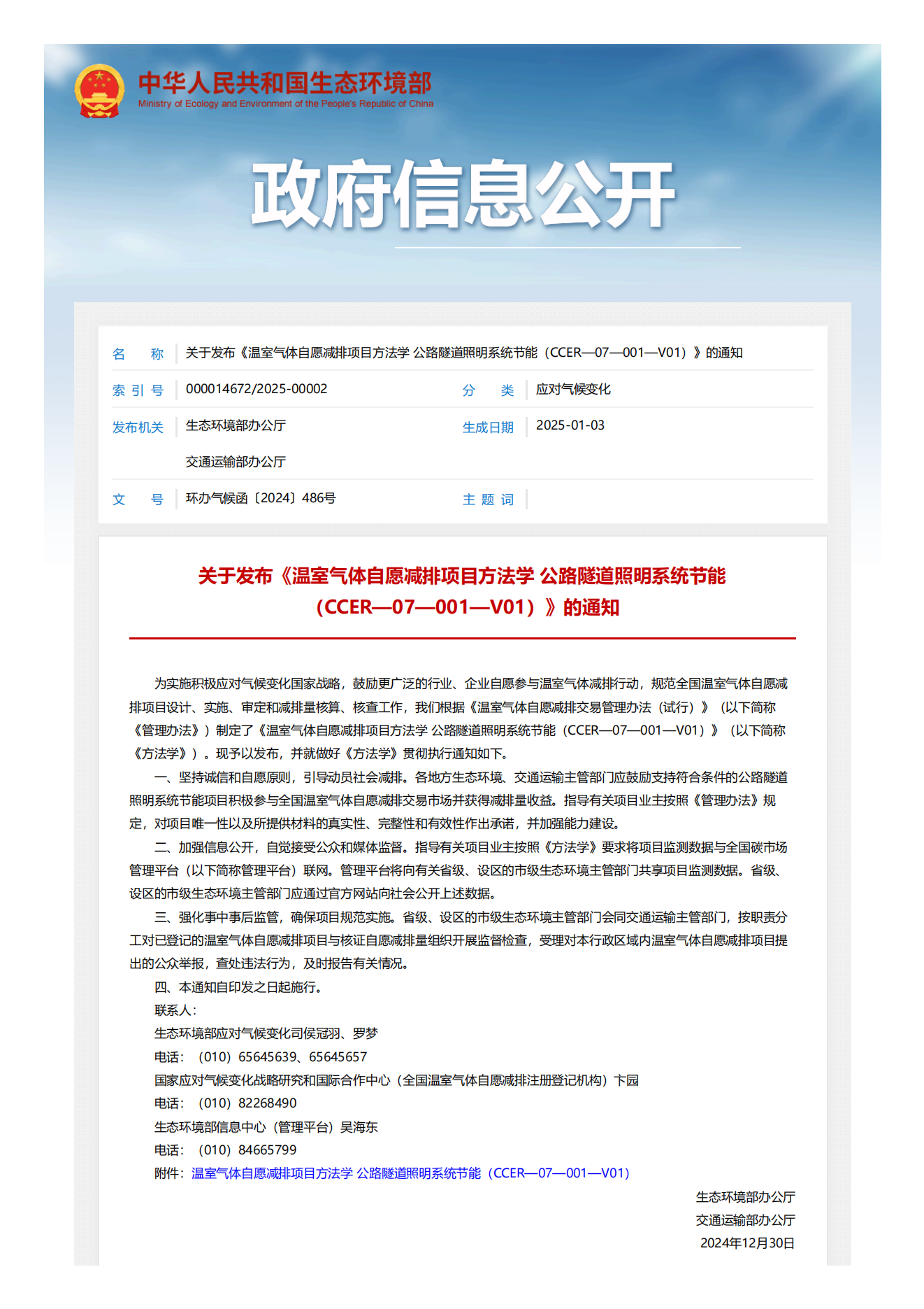 关于发布《温室气体自愿减排项目方法学 公路隧道照明系统节能(CCER—07—001—V01)》的通知
