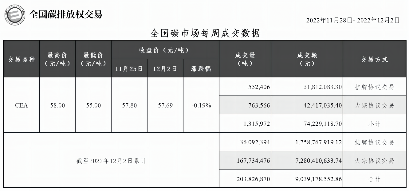 截至本周,全国碳市场碳排放配额(CEA)累计成交量203,826,870吨,累计成交额9,039,178,552.86元。