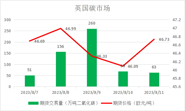 本周英国碳价最高价46.99欧元/吨,最低价46.09欧元/吨。
