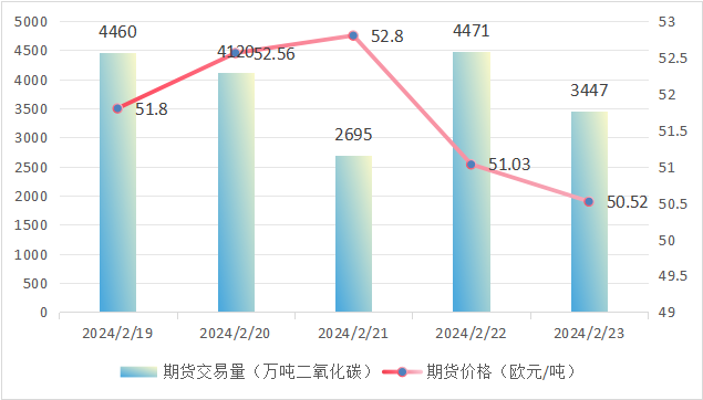 本周欧盟碳价整体由51.80欧元/吨下跌至50.52欧元/吨,跌幅2.5%。