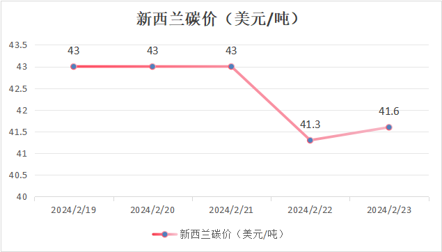 本周新西兰碳价呈现下跌趋势。新西兰碳价由43.0美元/吨下跌至41.6美元/吨,跌幅3.20%。