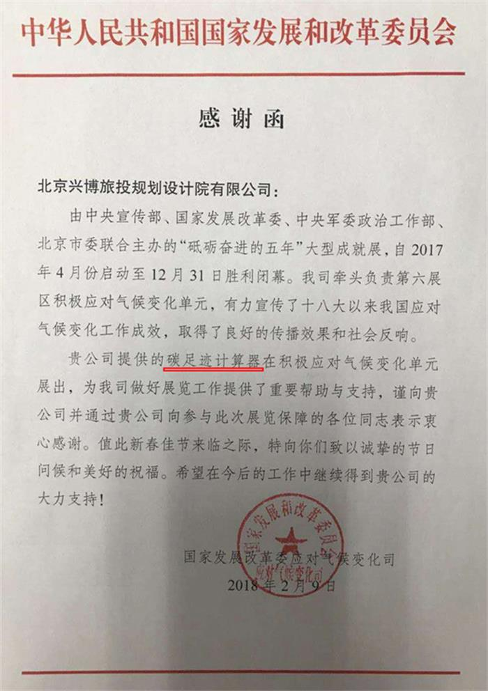 碳足迹计算器参加了由中共中央宣传部、国家发展和改革委员会、中央军委政治工作部、中共北京市委在北京联合主办“砥砺奋进的五年”大型成就展,获得发改委表扬肯定,特发感谢函。