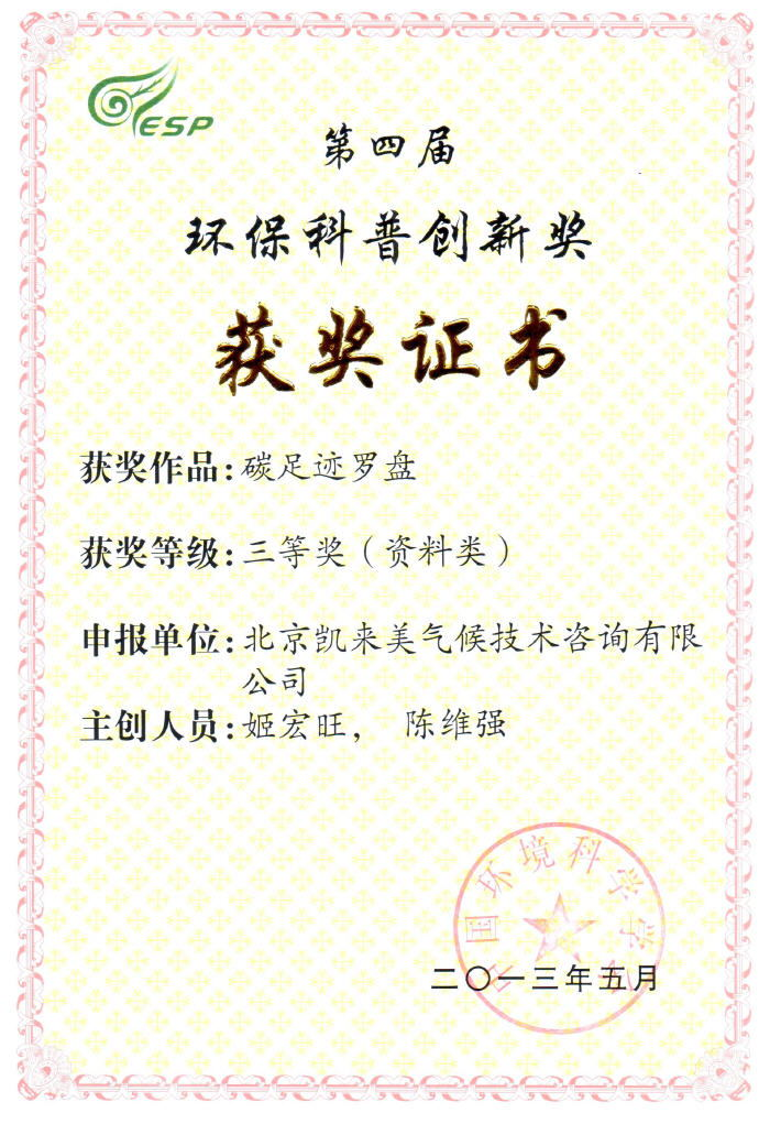 我公司科普产品“碳足迹罗盘”荣获第四届“环保科普创新奖”三等奖。环保科普创新奖由中国环境科学学会设立,每两年评选一次,本届是第四届,共推选出27部获奖作品,碳足迹罗盘荣获的是资料类三等奖。感谢中国环境科学学会的推荐,感谢社会各界朋友的支持与帮助。
