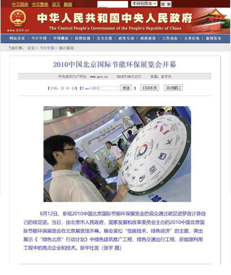 本次展会是本公司碳足迹计算器面市以来登陆的重量级展示平台,得到北京市政府相关承办单位高度认可并着力推荐采用。在展会开幕式上,中共中央政治局委员、北京市委书记刘淇,全国政协副主席林文漪,国家发展改革委副主任解振华,北京市市长郭金龙等领导饶有兴趣地观看并动手操作使用,由此可见碳足迹计算器是一款符合“低碳经济”建设,推动“低碳社会”发展的“应时之需”的好产品。